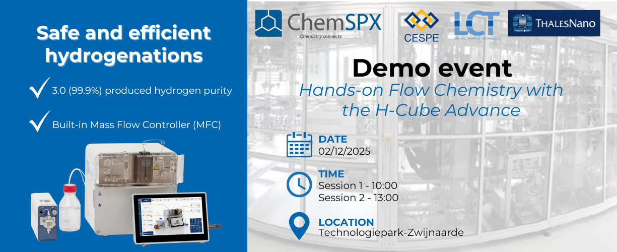 Partners from ChemSPX, LCT, ThalesNano and CESPE have come together to bring you an exciting demonstration event. It will showcase new tools shaping the future of flow chemistry and reaction engineering, offering participants the opportunity to engage directly with advanced equipment and experts in the field.